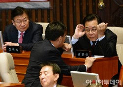 송언석 국민의힘 원내대표가 15일 국회에서 열린 본회의에서 유상범 원내운영수석부대표와 대화하고 있다.
