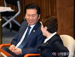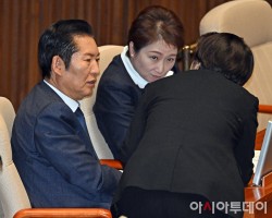 정청래 더불어민주당 대표가 15일 국회에서 열린 본회의에서 이언주 최고위원과 대화하고 있다.