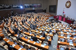 천하람 개혁신당 의원이 15일 국회에서 열린 본회의에서 윤석열·김건희에 의한 내란·외환 및 국정농단 행위의 진상규명을 위한 특별검사 임명 등에 관한 법률안에 대한 무제한토론(필리버스터)을 하는 가운데 더불어민주당 의원들이 회의장을 나서고 있다.