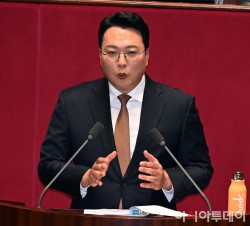 천하람 개혁신당 의원이 15일 국회에서 열린 본회의에서 윤석열·김건희에 의한 내란·외환 및 국정농단 행위의 진상규명을 위한 특별검사 임명 등에 관한 법률안에 대한 무제한토론(필리버스터)을 하고 있다.