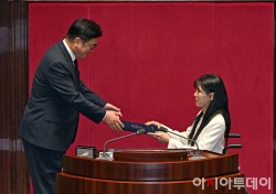 우원식 국회의장이 15일 국회에서 열린 본회의에서 이소희 국민의힘 의원의 선서문을 의장석에서 내려와 받고 있다.
