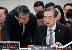 조현 외교부 장관과 김경협 재외동포청장이 6일 국회에서 열린 외교통일위원회 전체회의에서 대화를 나누고 있다.