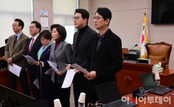 국회 법제사법위원회 국민의힘 위원들이 6일 국회 법제사법위원회 회의장에서 수석전문위원에게 추미애 위원장에게 전체회의 개회요구를 전달해 줄 것을 요청하고 있다.