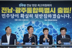 더불어민주당이 호남을 찾아 전남·광주 특별시의 발전을 약속했다.민주당 지도부는 6일 영광군 영광농협에서 현장 최고위원회 회의를 개최했다. 이날 한병도 원내대표는 "영광에서 최고위 함께 하니 더욱 영광스럽고 기쁘다"며 "영광군은 전라남도 27개 기초단체 중 가장 먼저 행정통합 대응 티에프(TF)를 구성하고 통합 준비를 해왔다고 들었다"고 말했다.이어 "진정한 변화는 변방에서 시작된다는 이 대통령의 오랜 철학이 이재명 정부의 과감한 결단으로 실현..