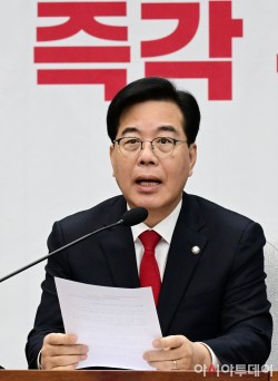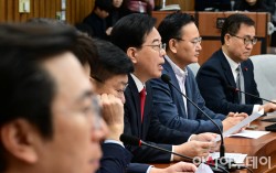 송언석 국민의힘 원내대표가 23일 국회에서 열린 원내대책회의에서 모두발언을 하고 있다.