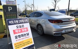 공공기관 승용차 2부제가 시행된 8일 서울 여의도 국회 둔치주자창에 차량 2부제 시행 안내문이 서 있다.