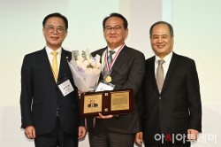 김현겸 팬스타그룹 회장(토목·81, 가운데)이 15일 오후 서울 광진구 워커힐호텔 워커홀에서 열린 '2026년 성균관대학교 총동창회 신년인사회'에서 2026 자랑스러운 성균인상을 수상한 후 기념촬영을 하고 있다. /정재훈 기자