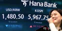 코스피가 미-이란 협상 기대감이 부활하며 장중 6000 재돌파헸다. 14일 서울 중구 하나은행 본점 딜링룸 현황판에 코스피 지수가 전장보다 159.13포인드(2.74%)오른 5,967.75을, 코스닥은 1,121.88을 보이고 있다. 환율은 전날보다 8.70원 내린 1,480.50원에 거래되고 있다,