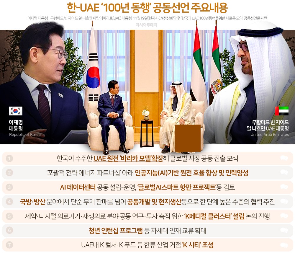 이번 공동선언문에는 AI·반도체, 원자력, 국방·방산, 'UAE K-시티' 등 공동 프로젝트 발굴, 물, 공중보건·의료, 교육, 문화·인적 교류 등 8개 분야의 구체적 협력 방안이 담겼다.