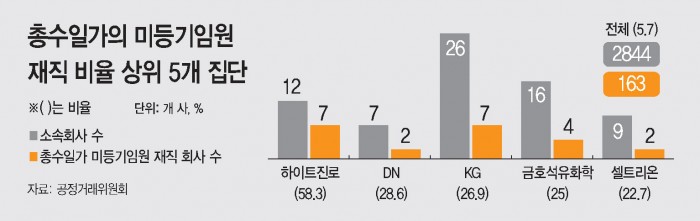 전체 분석대상 회사 중 총수일가가 미등기임원으로 재직하는 회사 비율은 집단 간 차이를 보였다. 하이트진로가 12개사 중 7개사로 비율로는 58.3%를 보여 가장 높았다. 하이트진로는 박문덕 회장 및 장남 박태영 사장 등이 주요 계열사에서 미등기임원으로 재직하고 있다. 이어 DN, KG, 금호석유화학, 셀트리온 순이었다.
