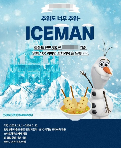 충북 충주의 위치한 한 골프장이 '아이스맨(ICEMAN)'이라는 겨울 이벤트를 홍보하며, 전반 9홀 종료 시 기온이 영하 15℃ 이하일 경우에만 꼬치어묵을 제공한다고 안내했다. 이벤트는 12월 1일부터 2월 22일까지 진행된다.