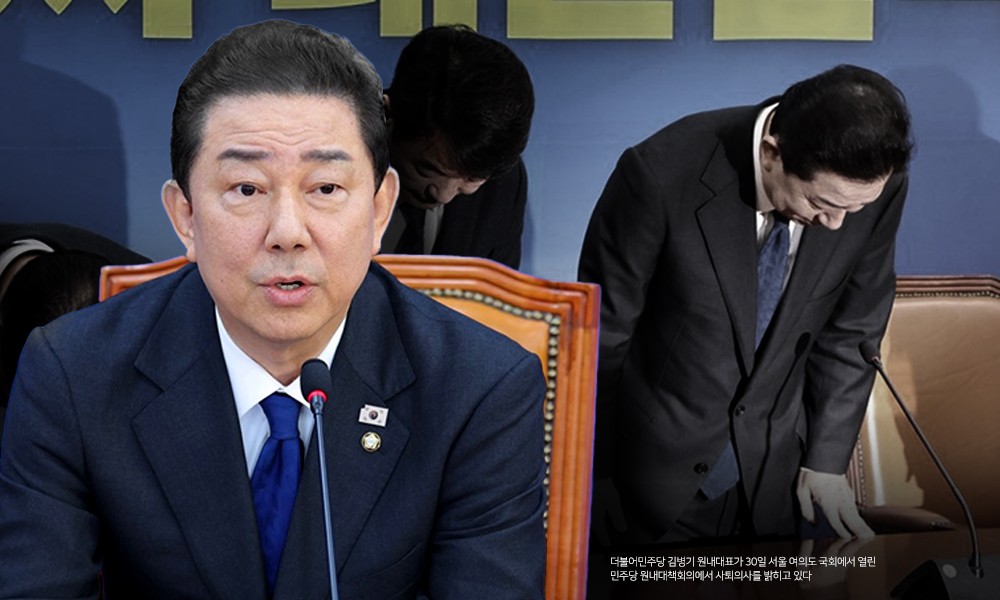 | 더불어민주당 김병기 원내대표가 30일 서울 여의도 국회에서 열린 민주당 원내대책회의에서 사퇴의사를 밝히고 있다. 연합/ 그래픽=박종규 기자 |