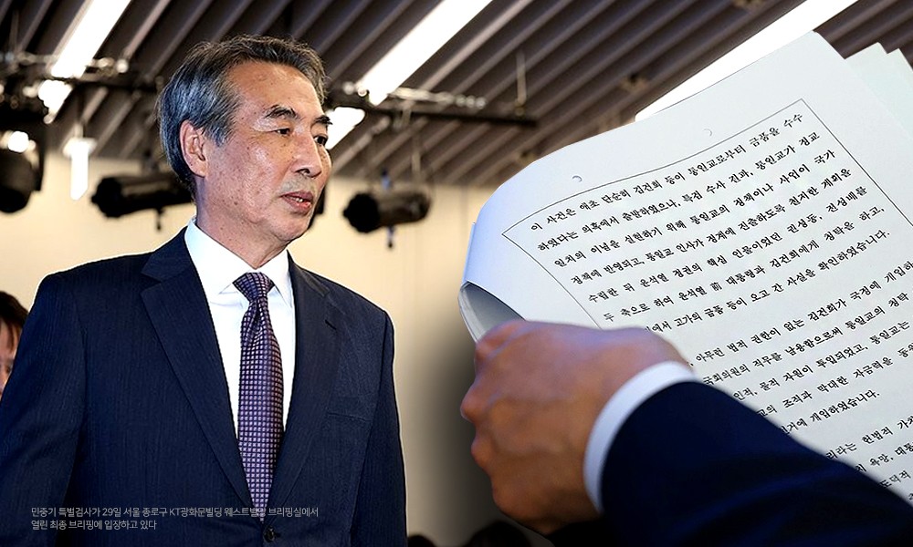 | 민중기 특별검사가 29일 서울 종로구 KT광화문빌딩 웨스트빌딩 브리핑실에서 열린 최종 브리핑에 입장하고 있다. 연합 / 그래픽=박종규 기자 |
