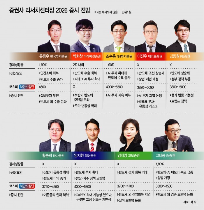 KB증권도 반도체 주도로 EPS(주당순이익)가 상승할 것이라며 올해 코스피 밴드를 3800~5000포인트로 전망했다. 김동원 KB증권 리서치센터장은 "올해부터 반도체 시장은 슈퍼 사이클을 넘어 메가사이클 진입이 기대된다"며 "정부의 자본시장 정책이 P/E(주가수익비율)를 지지할 것"이라고 설명했다. 대신증권은 올해 코스피 지수 하단은 4000포인트, 상단은 5300포인트가 될 것이라고 전망했다. 주요 증권사 리서치센터에서 제시한 코스피 지수 중 최상단 전망치가 가장 높다. 양지환 대신증권 리서치센터장은 "소버린 AI강화에 따른 AI수요가 추가로 확장되는 기회가 있는 상황"이라며 "올해 반도체 산업이 주도 산업 역할을 할 것"이라고 말했다.