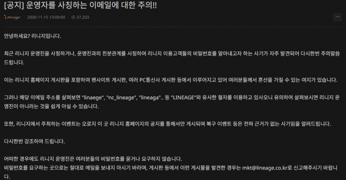 공식 홈페이지에도 올라온 확인 주문서 사기. /리니지 공식 홈페이지