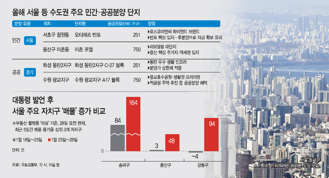 가장 민감하게 반응한 곳은 송파구다. 송파구는 대통령 언급 전인 이달 18~23일 5일 동안 매물이 84건 늘어나는 데 그쳤지만, 발언 직후 최근 5일간에는 164건이 새로 등록됐다.