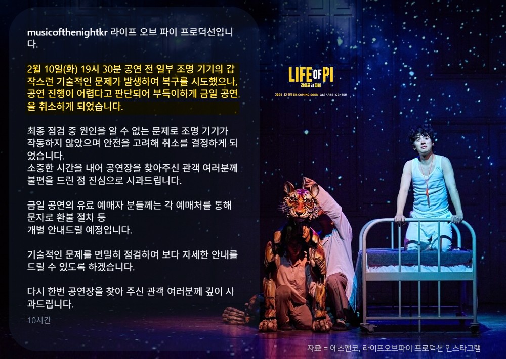 제작사 라이프오브파이 프로덕션은 지난 10일 공식 인스타그램을 통해 "10일 오후 7시 30분 공연 전 일부 조명 기기의 갑작스러운 기술적인 문제가 발생했다"며 "복구를 시도했으나 공연 진행이 어렵다고 판단돼 부득이하게 금일 공연을 취소하게 됐다"고 밝혔다.