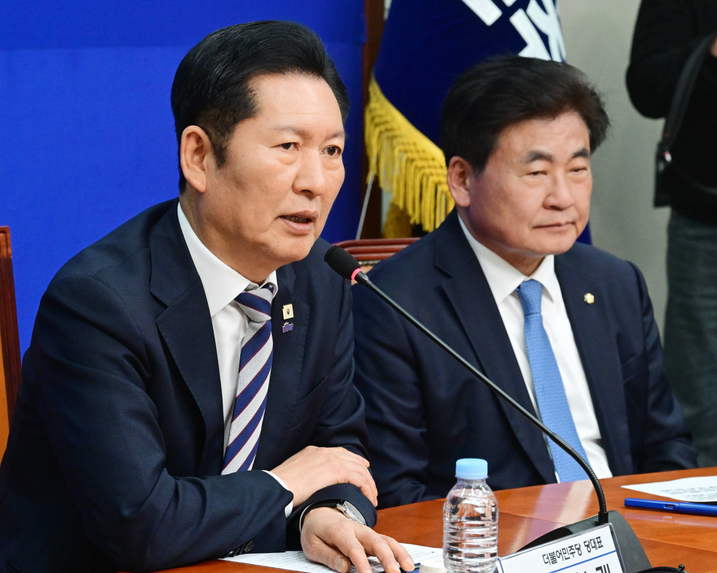 정청래 더불어민주당 대표(왼쪽)가 10일 국회에서 열린 중앙당 및 시·도당 선거관리위원장 연석회의에서 모두발언을 하고 있다. /이병화 기자
