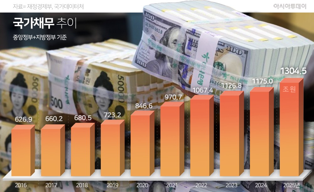 국가채무는 꾸준히 늘어 2022년 1067조4000억원으로 처음 1000조원을 넘었고, 2023년 1126조7000억원, 2024년에는 1175조1000억원이었다. 작년의 경우 1200조원대를 건너뛰어 1300조원대를 기록했다는 것은 증가 속도가 만만치 않게 빠르다는 뜻이다.