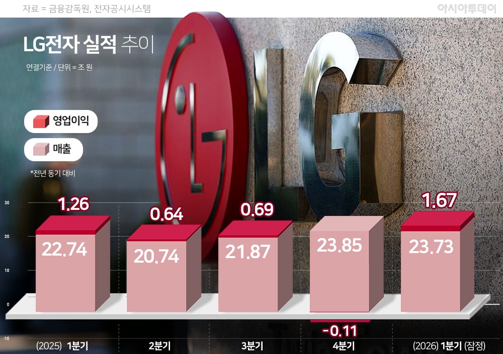LG전자는 7일 잠정실적 공시를 통해 1분기 매출 23조7330억원, 영업이익 1조6736억원을 각각 기록했다고 밝혔다. 전년 동기 대비 매출은 4.4%, 영업이익은 32.9% 증가한 수치다.
